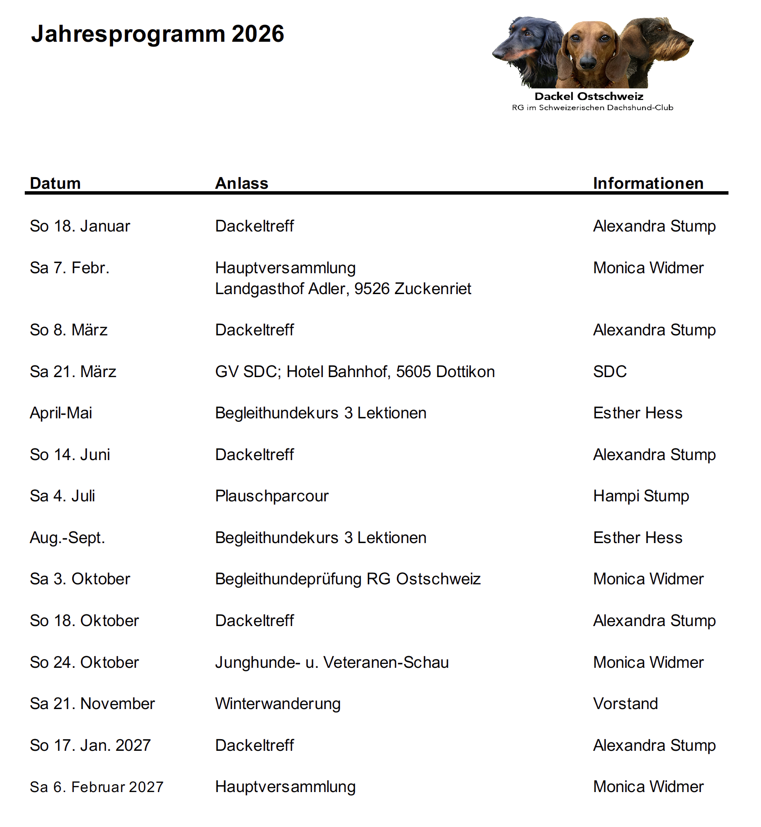 Wie ihr oben seht, ist das Dackelrennen nicht mehr aufgeführt. Nach vielen Jahren der Organisation, haben wir diese abgegeben.